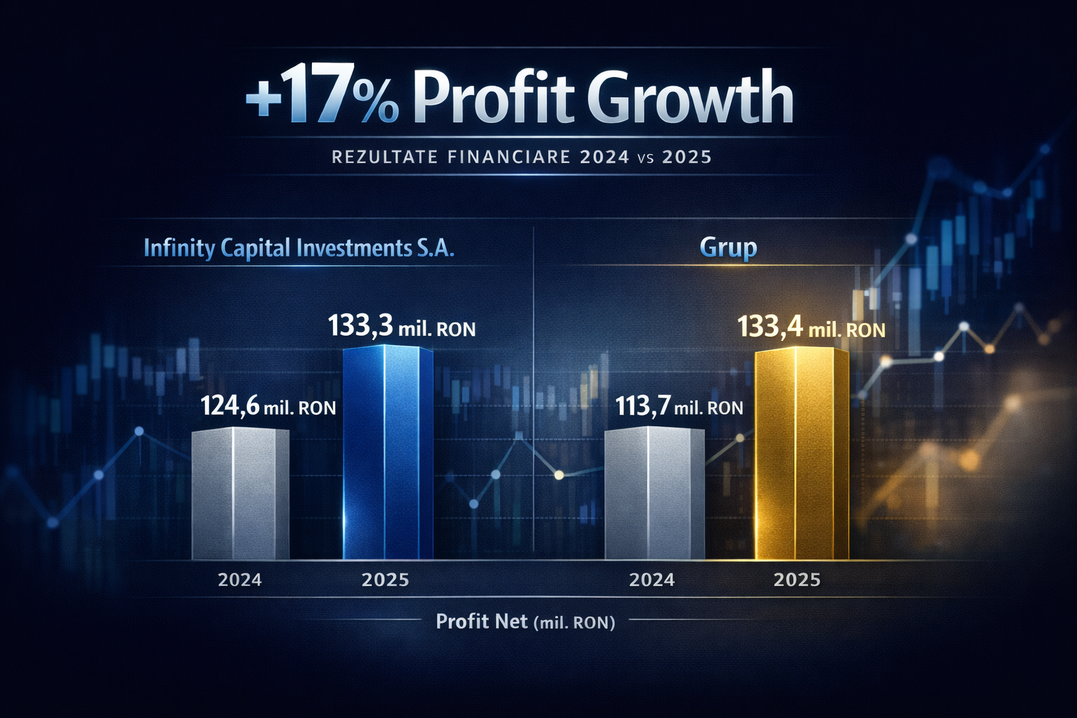 Infinity Capital Investments S.A. a înregistrat la finalul anului 2025 un profit net individual de 133,27 milioane lei, în creștere cu 9,15% față de nivelul de 124,62 milioane lei raportat în 2024, potrivit rezultatelor financiare preliminare publicate de companie. La nivel consolidat, profitul net a ajuns la 133,38 milioane lei, marcând o creștere mai accentuată, de 17,30%, susținută în principal de evoluția favorabilă a veniturilor din dividende și dobânzi.